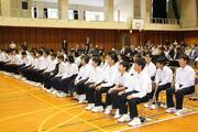 学校朝会で、中体連新人大会、江田島市ソフトテニス(オリーブ杯)大会、社会を明るくする運動の標語コンテスト部門の表彰を行いました。